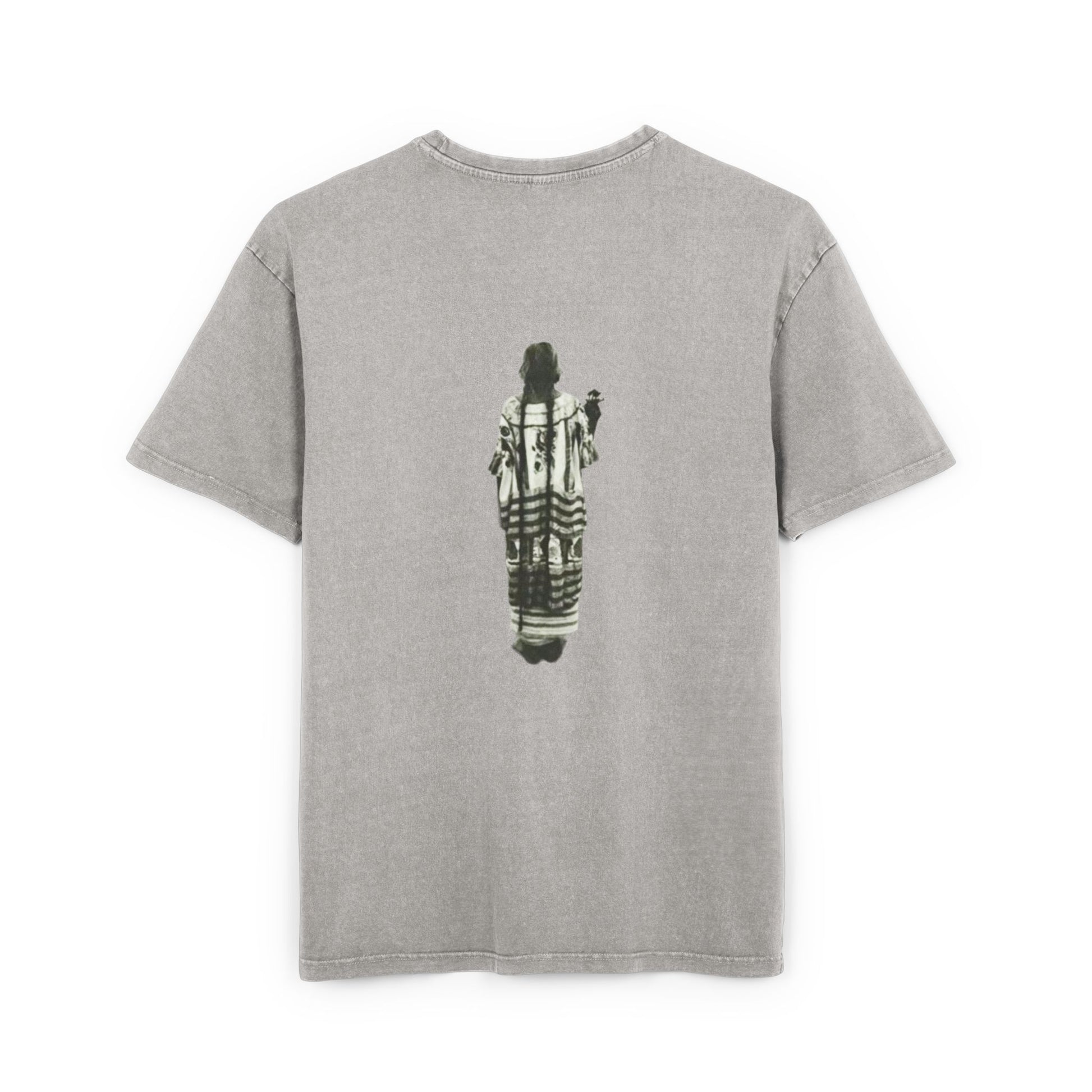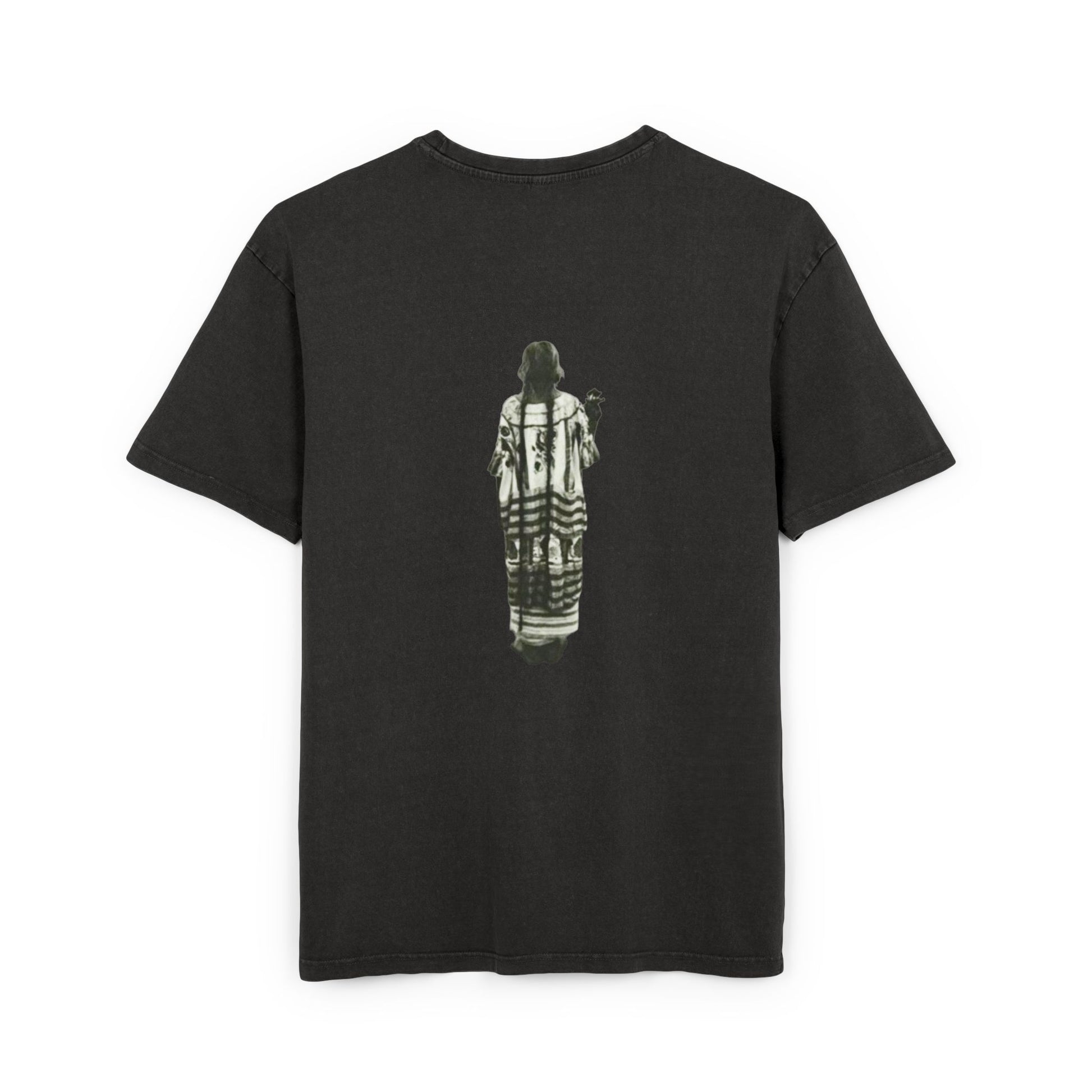 A lived-in, heavyweight tee that wears like a memory. The oversized silhouette drapes easily over the shoulders, while the acid-washed black gives each shirt a slightly faded, vintage presence. A lone, vertically aligned figure—rendered in muted grayscale—sits centered on both front and back, lending a quiet, introspective edge to the look. It’s the kind of shirt you reach for on slow mornings, late-night walks, or gallery nights when you want something comfortable that still feels thoughtful and artful.