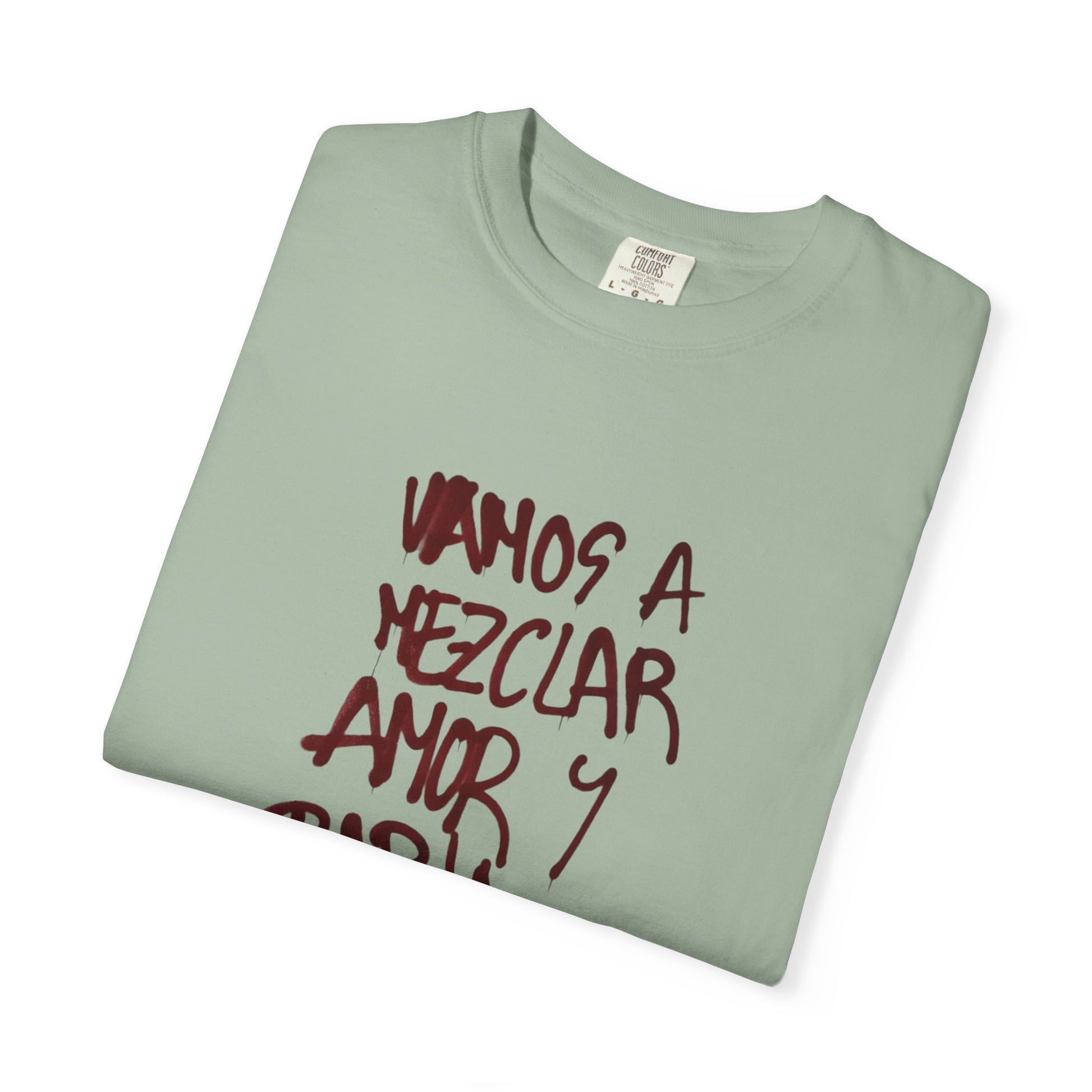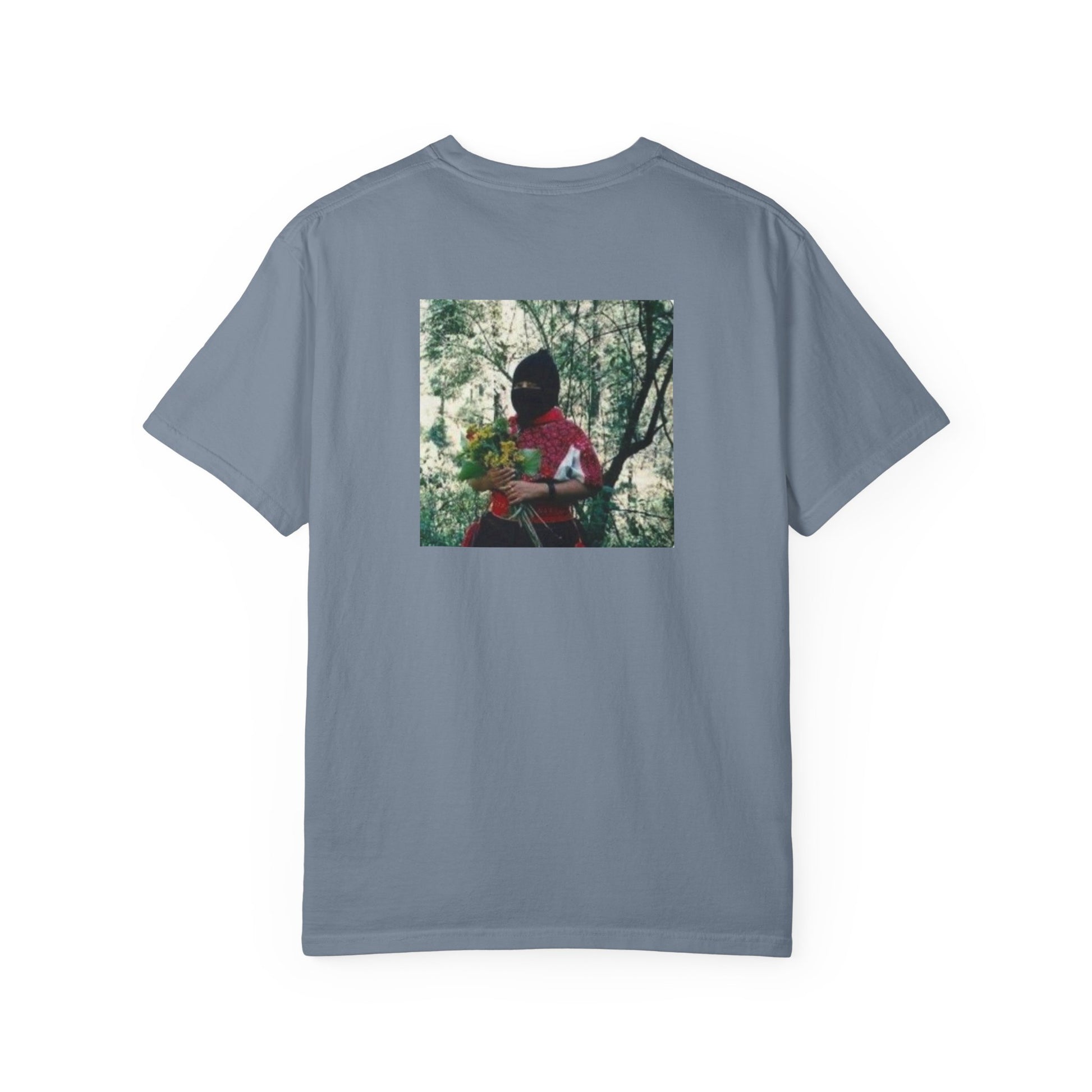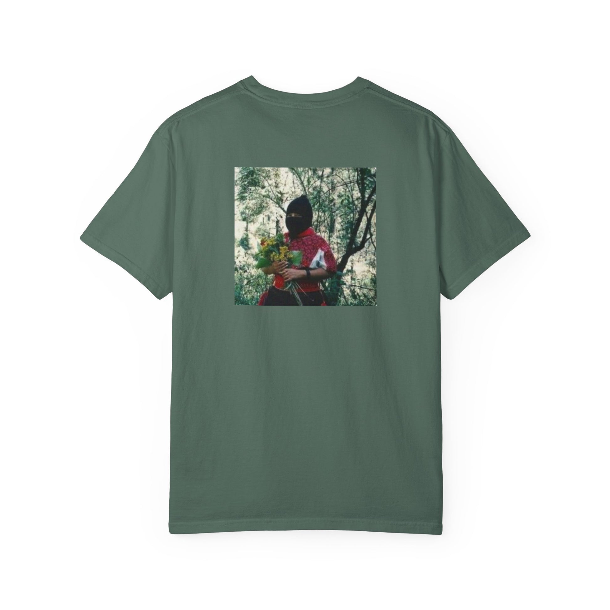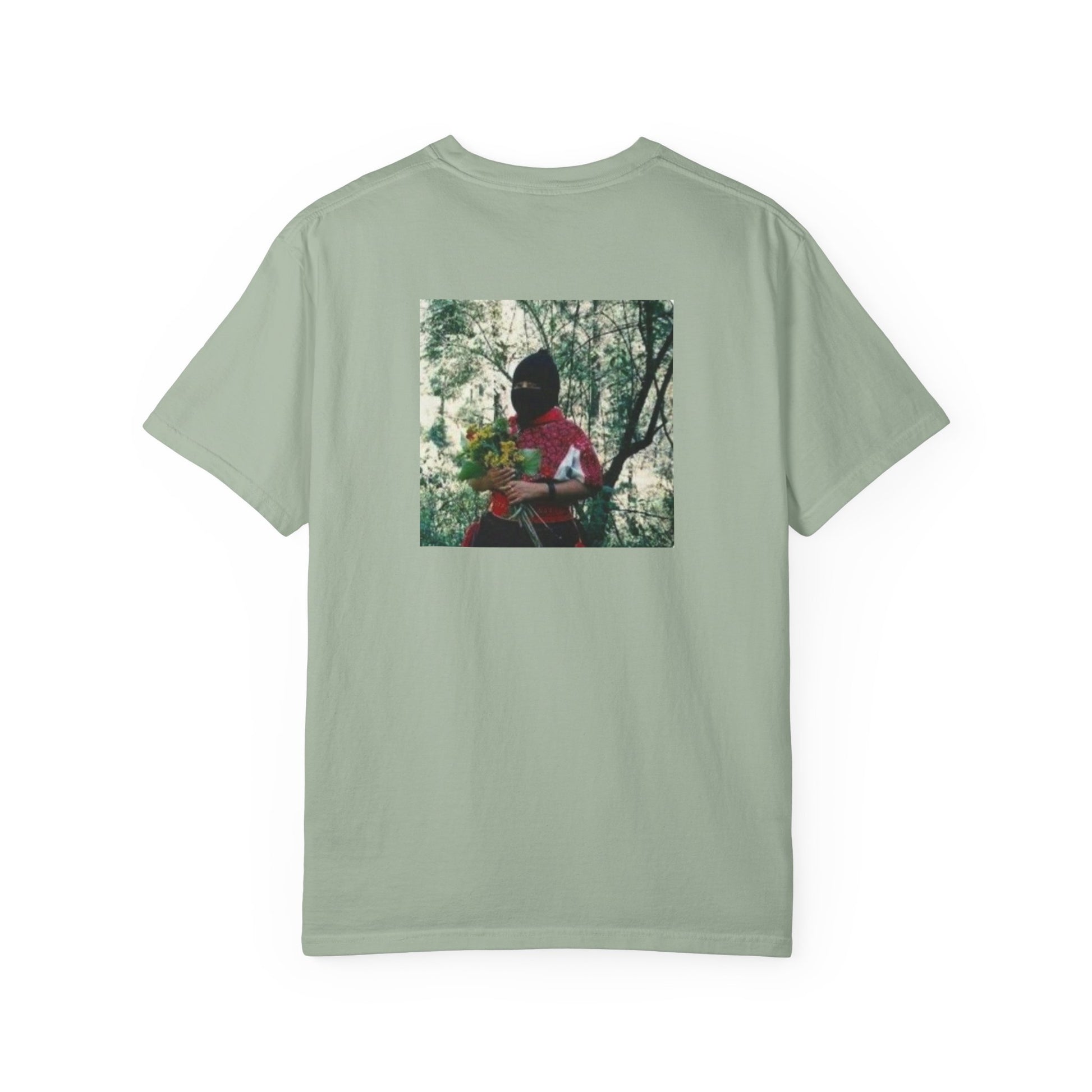 This relaxed, garment-dyed tee carries a lived-in softness and quiet attitude. The front’s hand-lettered Spanish phrase feels intimate and immediate; the back photo—earthy greens and a portrait lost in light—adds a cinematic, nostalgic layer. Wear it when you want clothing that reads like a memory: comfortable, slightly heavy, and quietly expressive. It sits loose over jeans or layered under an open flannel, and its muted dye tones make the graphics feel like part of the fabric rather than an afterthought. For people who collect moments and prefer clothes that speak in whispers rather than shouts.